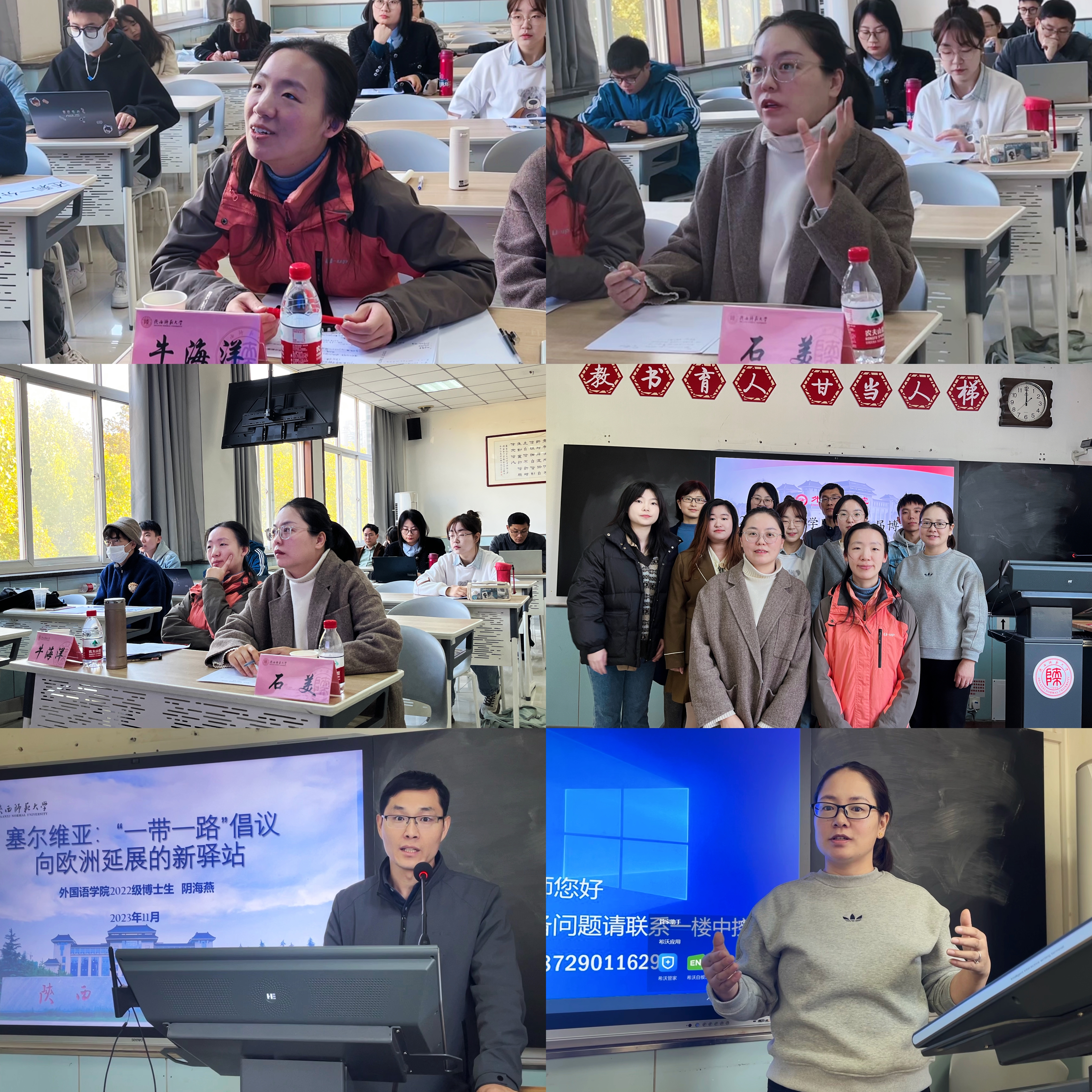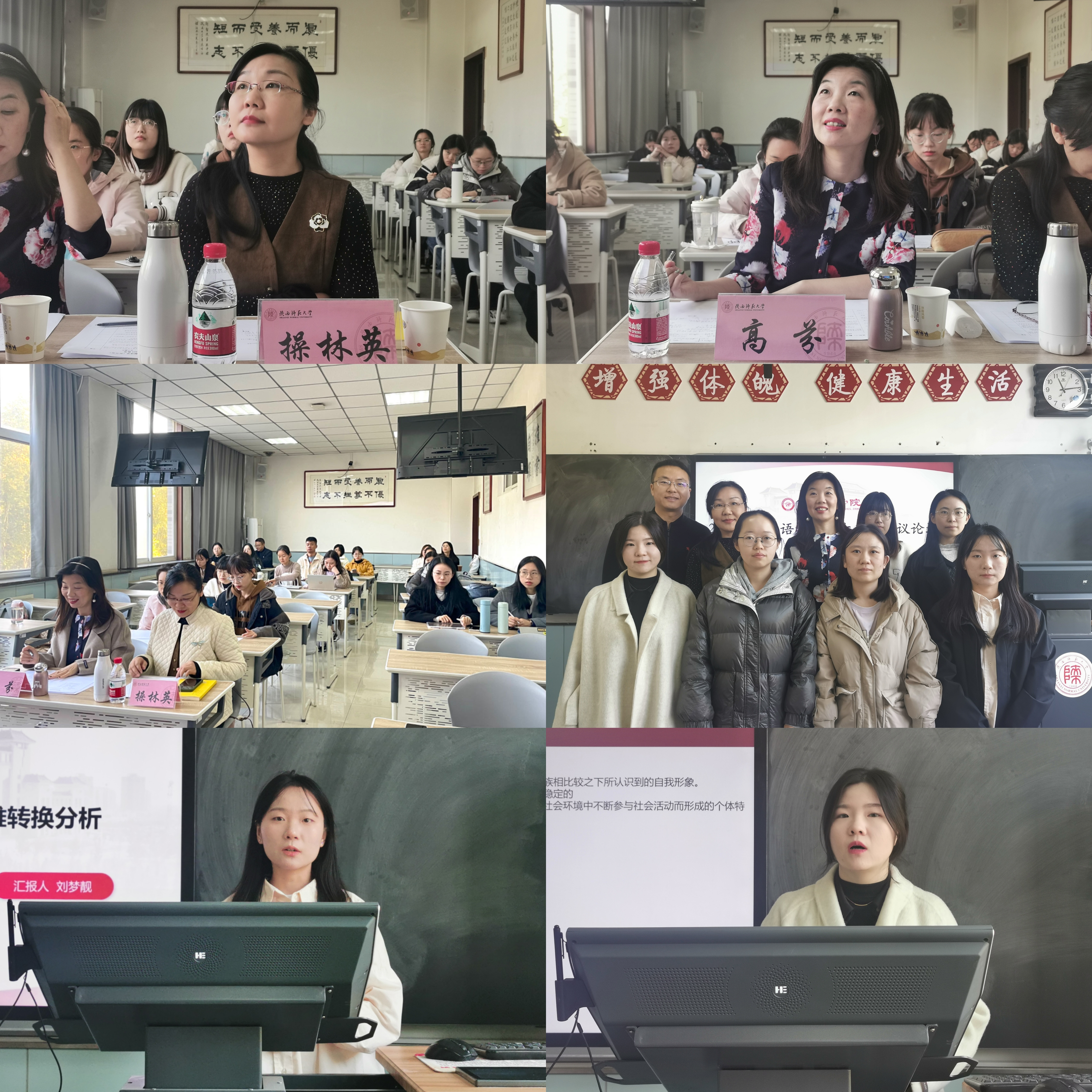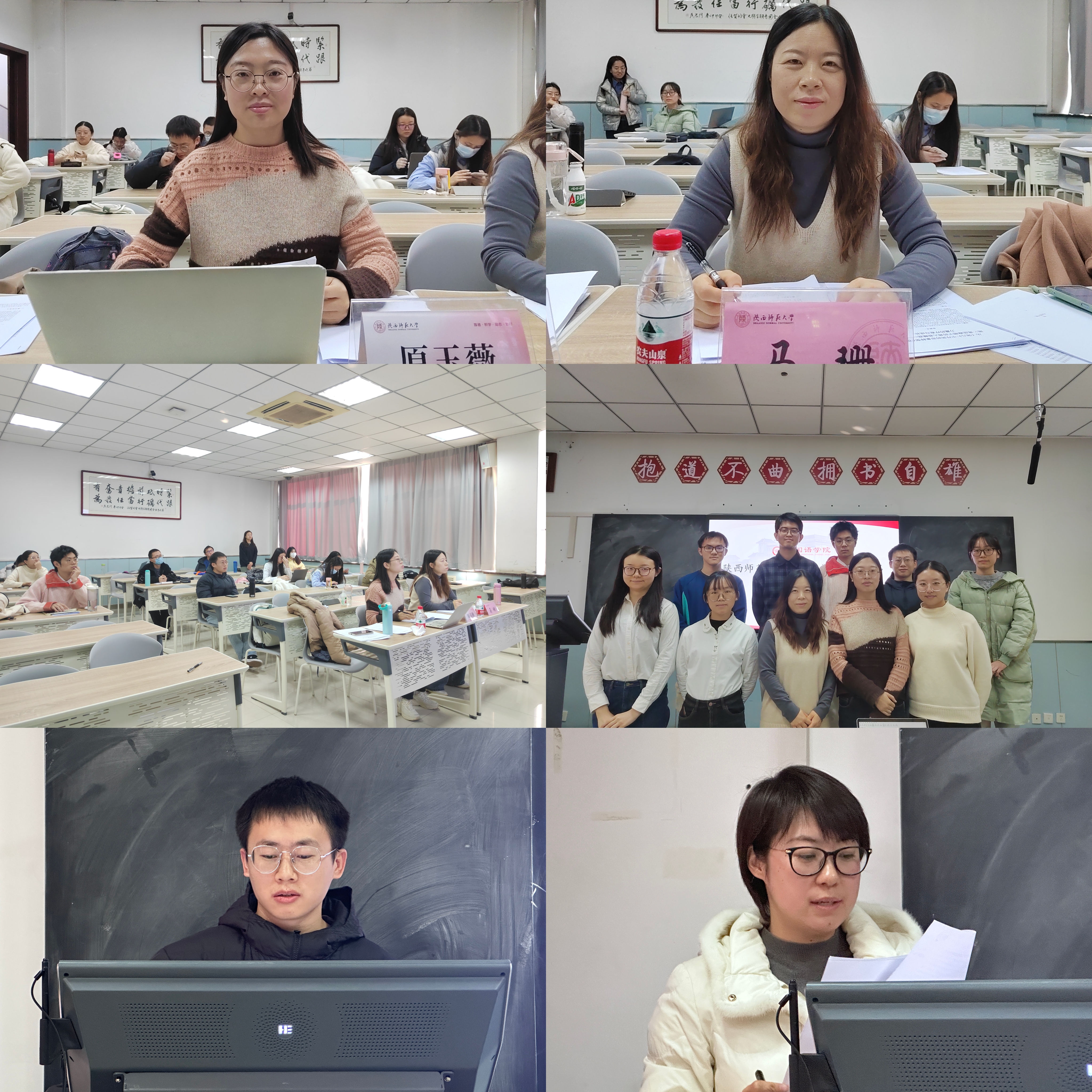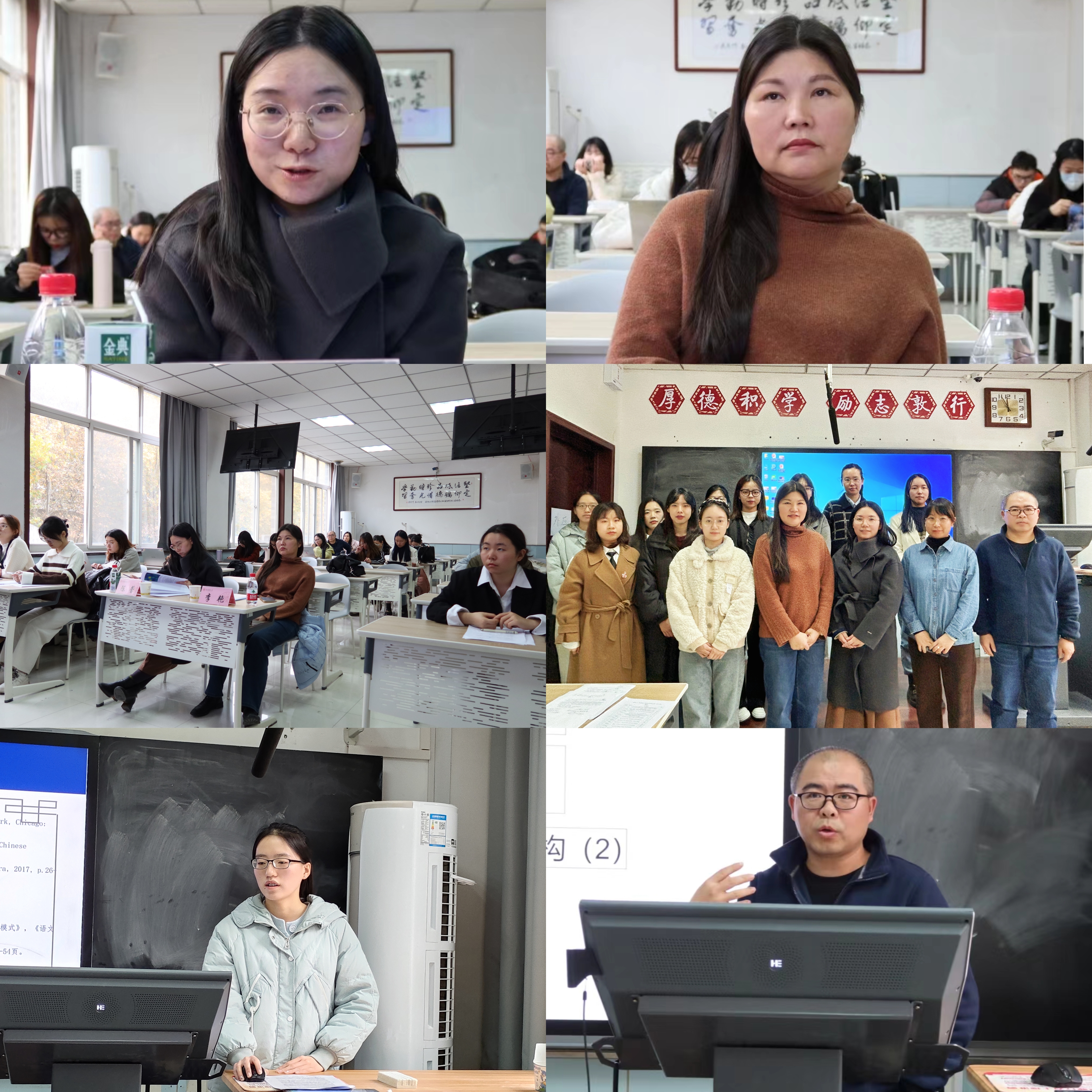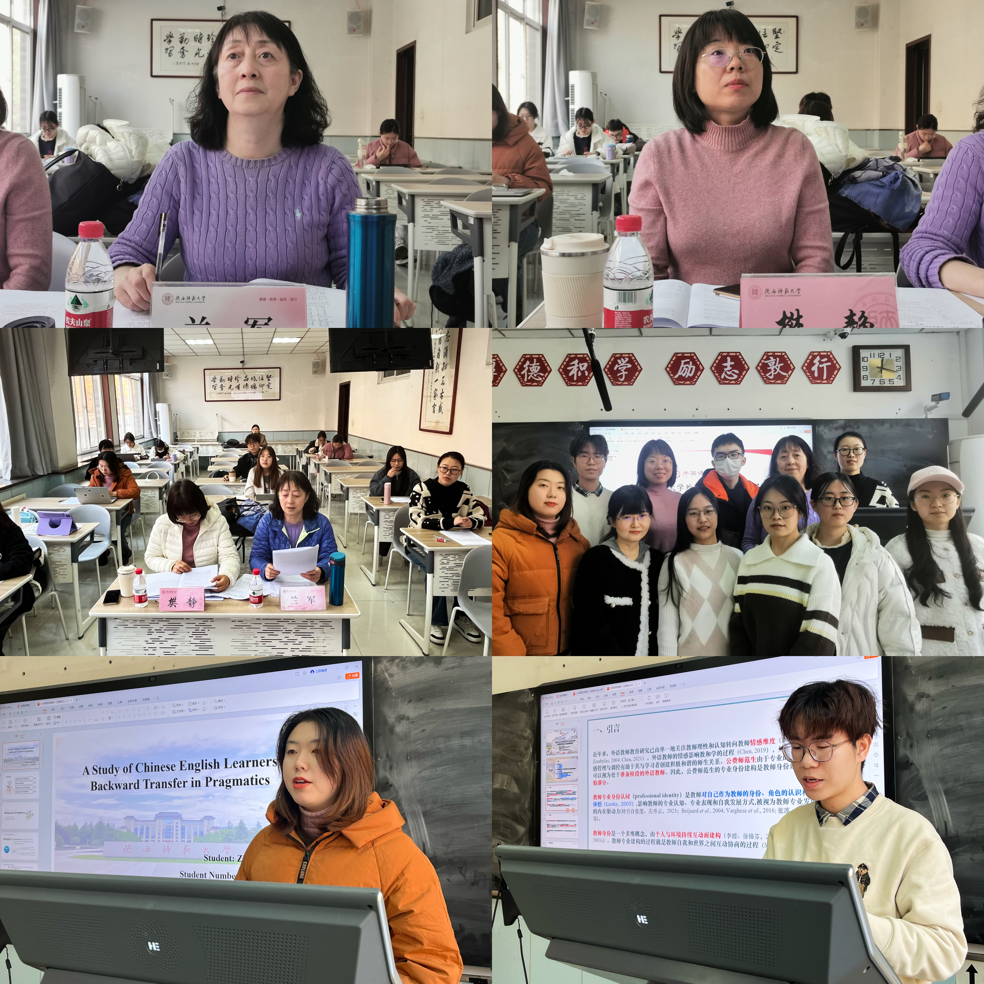 十名同学从多个主题出发进行了汇报。本科生廖一力、杨家硕、杨家硕与祝捷分别以“关中与陕北地区员工学习日语语言可能出现的语言迁移现象”“英语专业公费师范生专业身份构建和情感体验交互的叙事研究”“‘大单元—过程体裁’教学新理念:阅读和写作教学的互动研究”为题进行讲述。硕士生董雪冉、刘彦媛、张昕冉、张一菊、钟晓琳、周彤、张燕堃分别以“‘X有自己的Y’的构式演变及认知阐释”“词语符号性视域下‘丝绸之路’语言学命名的研究”“The Study of Chinese English Learners’ Backward Transfer in Pragmatics”“基于核心素养的初中英语反思性教学个案研究”“在线语料库资源对英语写作表现影响研究(Study on the Effects of Online Concordancer on L2 Writing Performance)” “Effects of ‘Internet Plus Education’ on English Major’s Listening and Speaking Proficiency” “A Study of English Majors’ Cognitive Style, Grammar Learning Anxiety and Grammar Learning Achievements—An Example of Beijing University of Chemical Technology” 为题进行分享。博士生王颖平以《华州方言文白异读研究》为题进行讲述。两位评委老师各抒己见、细致点评,指出了同学们论文研究方法、行文结构等方面存在的问题,并提出了宝贵的意见与建议。