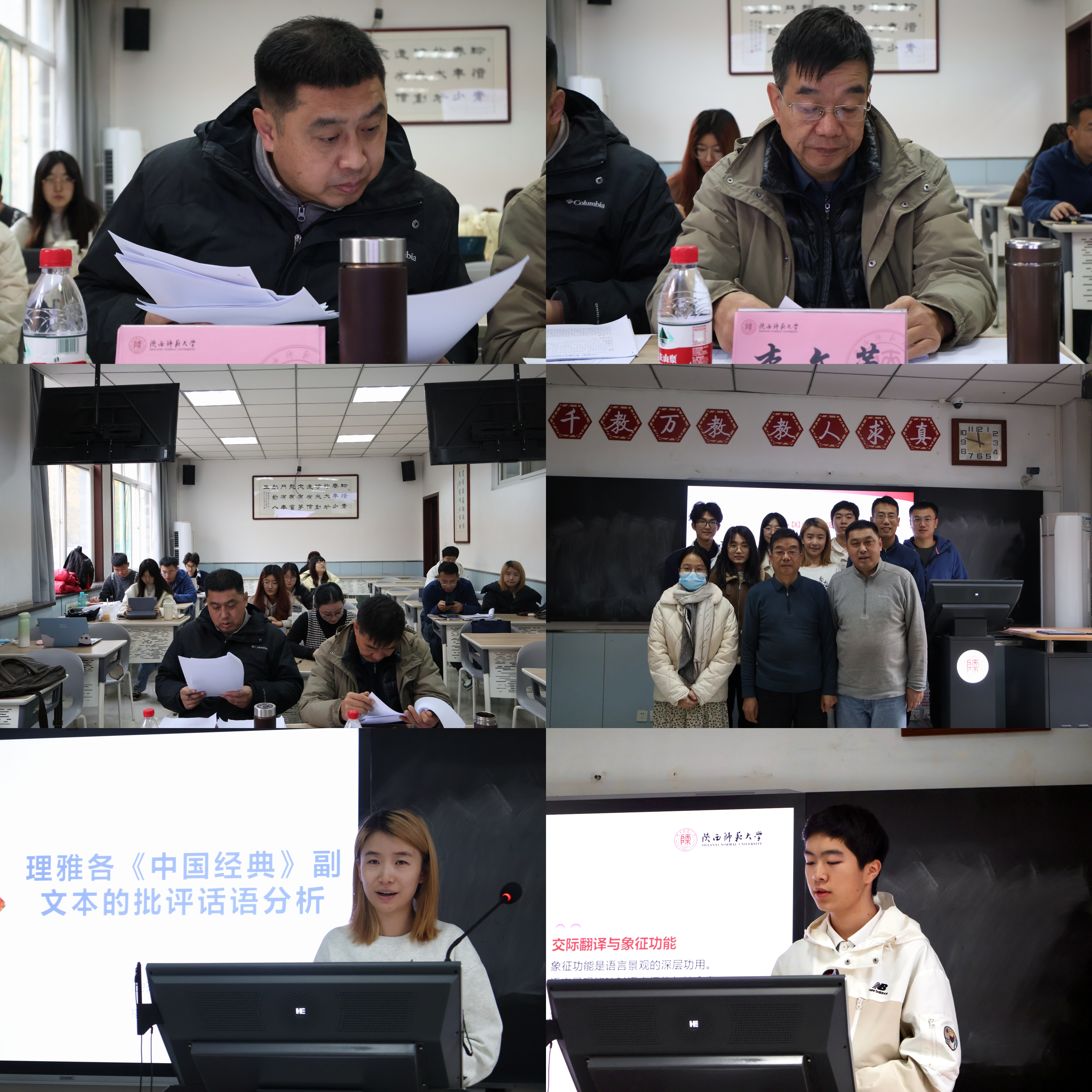 八名同学先后从不同角度做了研究汇报。本科生侯奕彤以“交际翻译视角下的汉英语言景观建设情况与思考——以陕西省西安市大慈恩寺和大兴善寺为例”为题进行汇报。硕士生张雪香、张亚楠、朱剑峰、郭英、许怀民分别以“《许三观卖血记》中前景化语言的英译策略研究”“文本类型论对传记文学翻译的指导——以 Augustus:The Life and Tims of the Founder of the Roman Empire(节选)汉译为例”“建筑工程翻译译者行为批评分析——以项目翻译为例”“苏轼词作译者群体行为批评分析——以《念奴娇·赤壁怀古》英译本为例”“语境文化理论视阈下中西方委婉语文化内涵的对比研究”为题汇报。博士生关相东、李文玉则以“旧论新释:鲁迅翻译思想的现代性发微与开拓”“理雅各《中国经典》副文本的批评话语分析”为题进行汇报。两位评委老师高度肯定了每位汇报人的学术精神,并就论文中出现的格式与内容问题提出了修改意见。