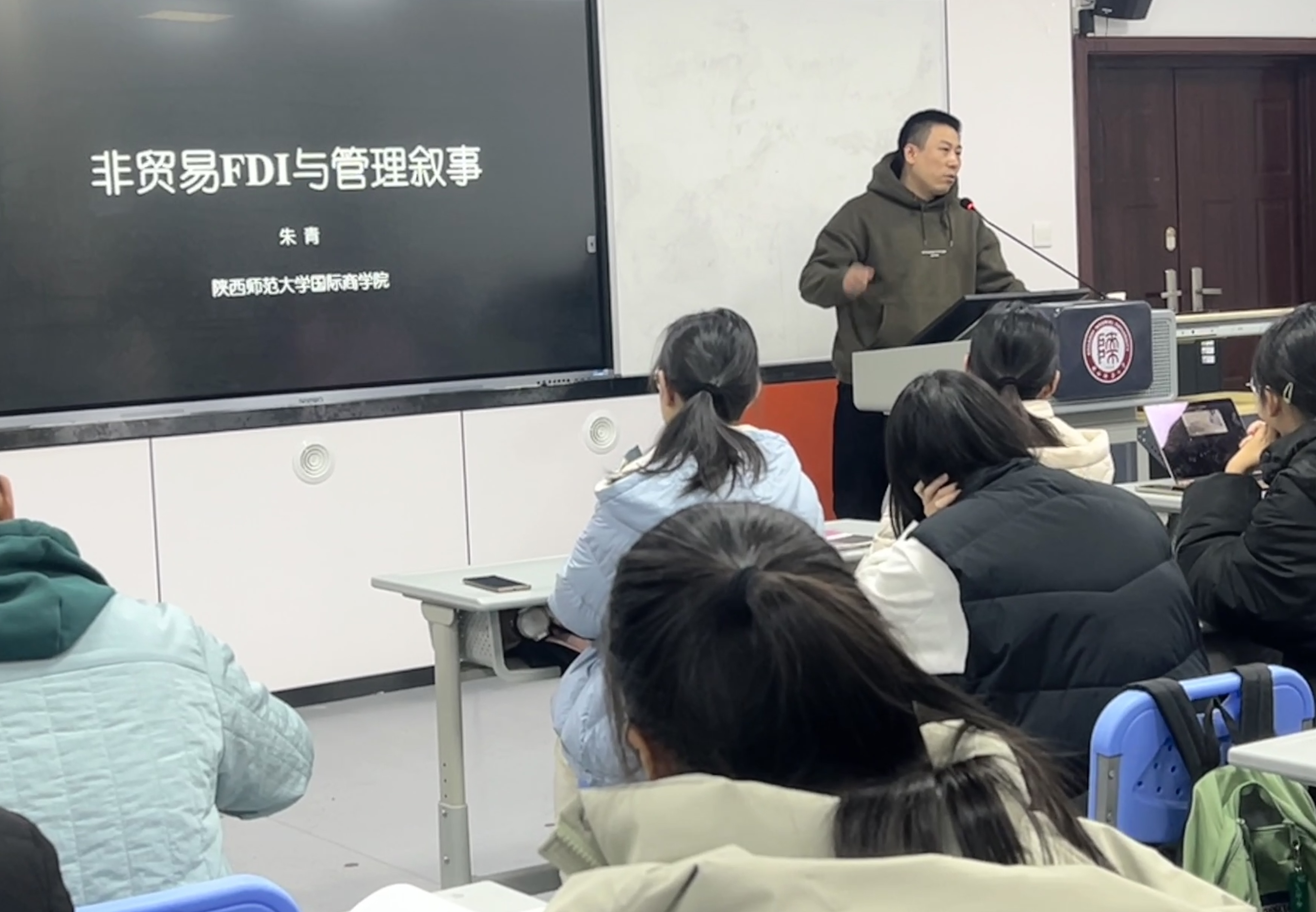 讲座中,朱教授从非贸易FDI的定义、管理叙事的价值、发展中的中国FDI与ODI、中国管理叙事的国际化以及管理叙事在企业决策中的关键作用等四个方面讲述。通过大量详实经典的商业案例分析和实战经验分享,伴随着幽默诙谐又深度解析的风格,朱教授为同学们打开一扇通向国际贸易的大门。最后,朱教授留下了一个引发各位同学沉思的问题:作为语言工具的潜在受益者全体,我们将如何面对一个不用工资、不会疲惫的人工智能体?