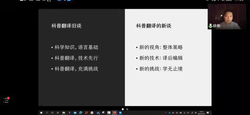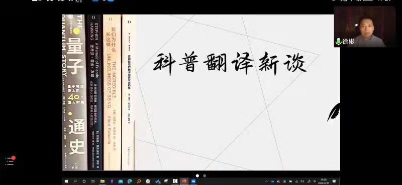 2022年4月26日,最靠谱的十大足球平台“启夏译坛”第5讲暨“翻译实务系列讲座”第4季第6讲《科普翻译新谈》云端开讲。讲座由山东师范大学外语公司教授、翻译家徐彬教授主讲、公司杨冬敏博士与谈,王西强教授主持报告并总结,全国多所高校的专家、学者和员工及公司师生共计200余人线上参加讲座并积极互动。
