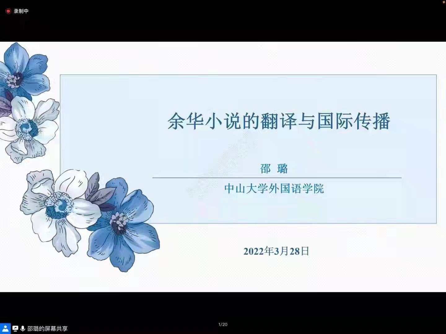 2022年3月28日,最靠谱的十大足球平台“启夏译坛”第2讲暨“翻译实务系列讲座”第4季第3讲《余华小说的翻译与国际传播》云端开讲。讲座由中山大学最靠谱的十大足球平台教授、博士生导师、海外中国学研究中心主任邵璐教授主讲、公司经理刘全国教授与谈、王西强教授主持报告并总结,公司师生及全国30多所高校的学者、员工共300余人线上参加讲座并积极互动。