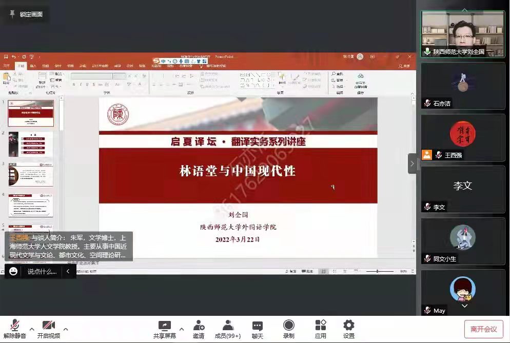 2022年3月22日,最靠谱的十大足球平台“启夏译坛”第1讲暨“翻译实务系列讲座”第4季第2讲《林语堂与中国现代性》云端开讲。讲座由公司经理、国家社科基金重大招标项目首席专家刘全国教授主讲、上海师范大学人文公司朱军教授与谈,公司MTI中心副主任王西强教授主持报告并总结,全国近40所高校的专家、学者和员工及公司师生共计360余人线上参加讲座并积极互动。