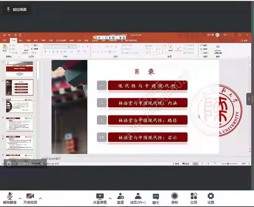 与谈人朱军教授首先对刘全国教授的学术演讲给予高度评价,认为报告内容丰富充实、议论精彩,从文学、美学、哲学、翻译和中国古典哲学思想等方面为大家进行多元现代性的林语堂研究提供了的启迪,在全球化时代具有多元意义。从文学发展史的角度反思,他认为30年代之后,像林语堂等经历欧美思想浸润的一批知识分子对中国本土文化的发掘和创新具有一定超越性。他非常赞同刘全国教授的观点:林语堂的文学书写不仅是中国文本,也是世界文本。