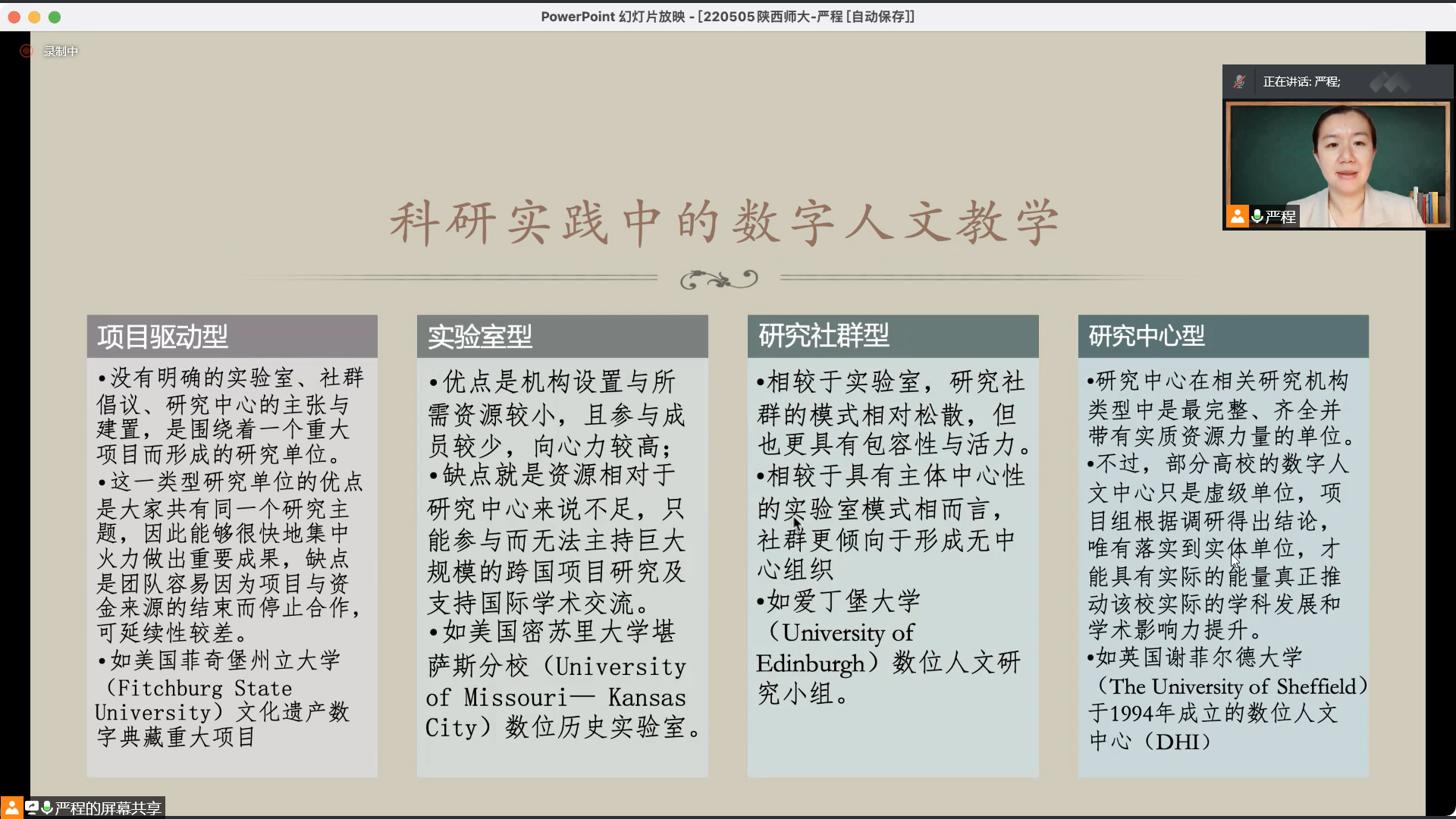 严程老师以自身所在的数字人文项目群组的科研经历为导入,介绍了数字人文包含的具体内容以及涉及的相关研究工具,指出数字人文在当下与教学、科研和学术体验息息相关。在谈及数字人文的发展过程时,她指出,数字人文最早可以追溯到阐释学中涉及的人文计算,即运用计算机手段实现语汇索引和文本分析研究。随后严程老师依据时间脉络,介绍了上世纪八十年代的主题性文本数据库,20世纪末的中文古籍数据库以及新世纪正式提出 “数字人文”的(Digital Humanities)概念。同时,严程老师以中国历代人物传记资料库、远读、“中国近代思想史专业数据库”等为例阐述了数字人文在进行关系网络的分析和量化时重要作用。