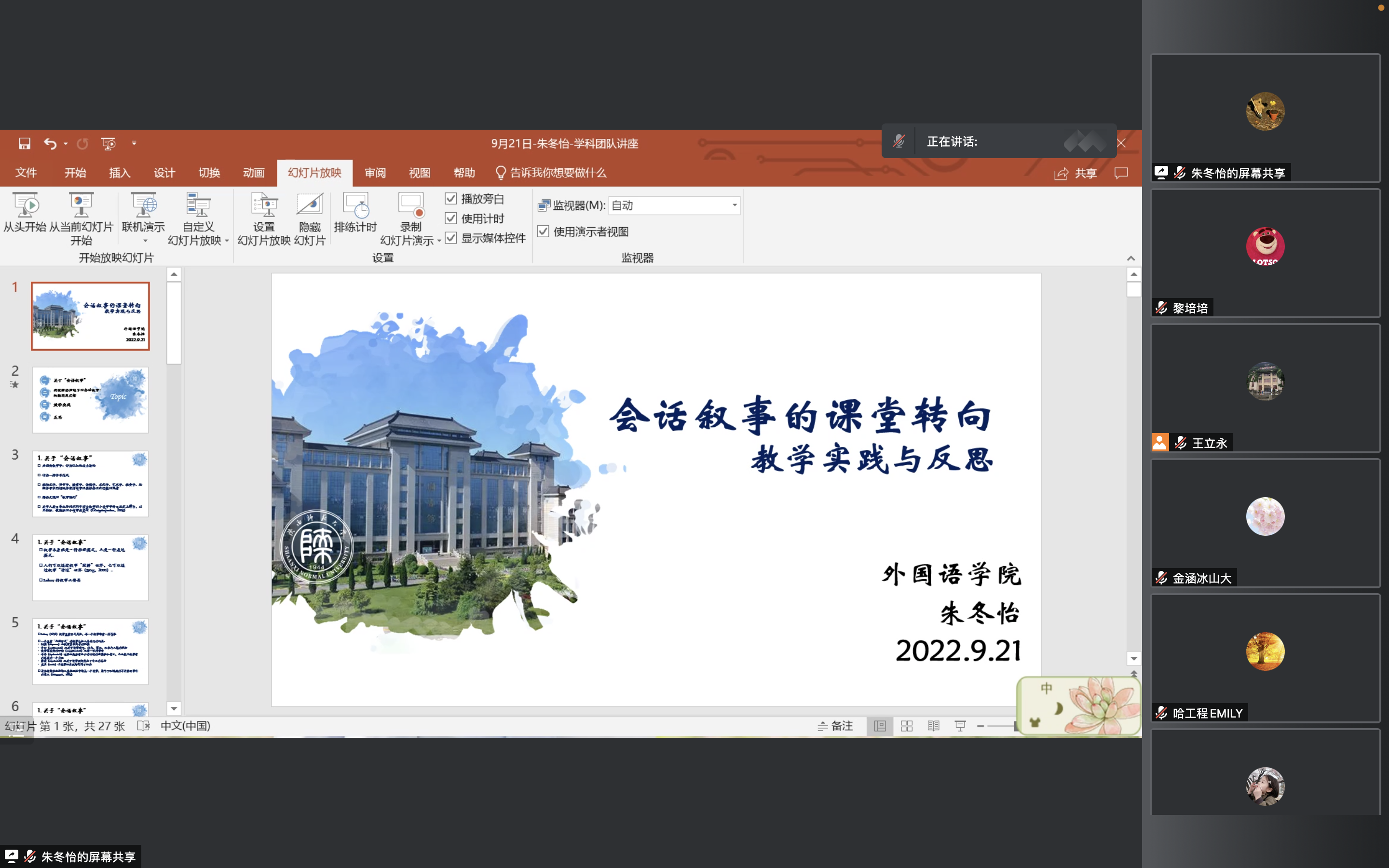 朱冬怡副教授首先从会话叙事本身谈起,表明会话叙事就是日常会话中的故事讲述行为。接着,她以时间为脉络,简单梳理了叙事学的发展路径。朱冬怡副教授深入浅出,用生动的事例,层层论证会话叙事的要素及特征。最后,朱冬怡副教授以自身研究经历为出发点,通过展示课堂语料,同大家分享了如何进行课堂语境下的会话叙事研究,并强调课堂语境下的会话叙事能调动员工的学术情感及思辨性能力,研究贯穿于教学之中,二者相互促进,相互融合。