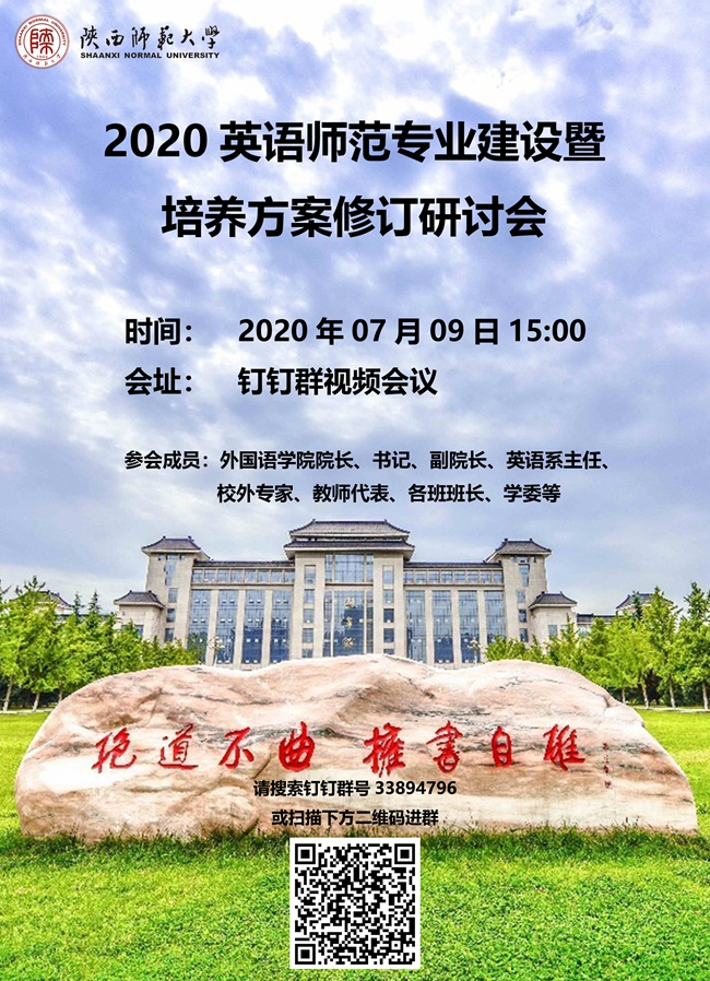 兹定于2020年7月9日(星期四)下午15:00,在钉钉群会议(33894796)召开2020英语师范专业建设暨培养方案修订研讨会。